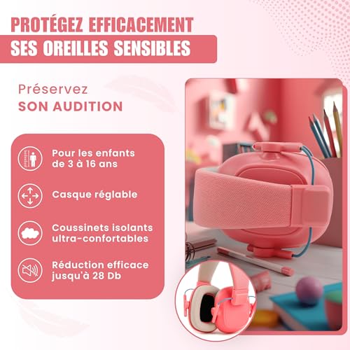 - Réduction du Bruit : Régule les bruits ambiants, essentiel pour préserver la santé auditive de votre enfant, tout en garantissant un port confortable grâce à son ergonomie et ses coussinets.
