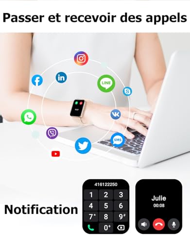 Appel Bluetooth et Notifications : Grâce à son haut-parleur et microphone intégrés, passez et répondez aux appels directement depuis votre poignet. Restez connecté avec les alertes de vos applications favorites comme Facebook, Instagram, et WhatsApp.