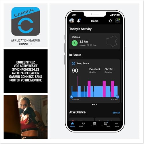 - Suivi quotidien : Enregistre vos pas, la fréquence cardiaque et les calories brûlées, disponibles sur l'application Garmin Connect.