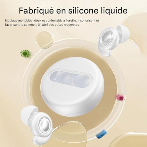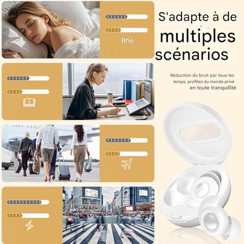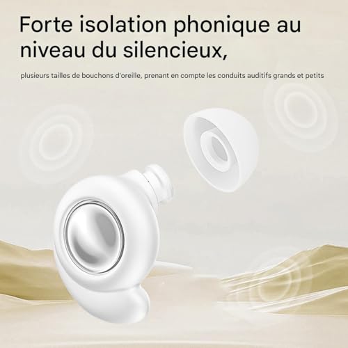 Matériau : Fabriqués à partir d'ABS et de silicone respirant, ces écouteurs assurent un port prolongé sans pression ni gêne, soulageant ainsi les oreilles sensibles. Réduction du bruit : Profitez d’un environnement paisible grâce à la technologie de réduction de bruit qui atténue jusqu'à 35 dB, bloquant efficacement les ronflements et autres bruits environnants pour un sommeil ininterrompu. Ergonomique : Le design en silicone imitant la sensation de la peau épouse parfaitement la forme de l’oreille, garantissant qu'ils restent en place toute la nuit sans causer d’irritation. Performance : Dotés d'une autonomie prolongée et d'un réglage intuitif des modes par simple toucher, ces écouteurs sont parfaitement adaptés au sommeil, au bureau, lors de voyages ou de méditation.