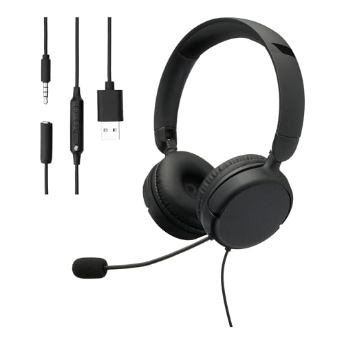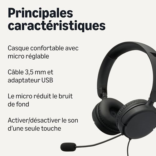 Design : Casque sur les oreilles, extra-auriculaire, avec coussinets doux et un bandeau réglable pour un confort prolongé. Microphone : Micro à perche flexible et réglable, permettant un placement optimal et garantissant une qualité sonore claire avec son omnidirectionnel. Commande intégrée : Boîtier de commande intuitif avec fonction de coupure et mise en sourdine instantanée, facilitant le contrôle de vos communications. Compatibilité : Fonction "Plug and play" avec les appareils dotés d'un port 3,5 mm ou USB, comme les PC, ordinateurs portables, tablettes et smartphones. Transport : Un câble adaptateur et un guide de configuration rapide inclus, facilitant le branchement et le paramétrage de votre casque.