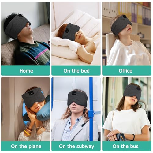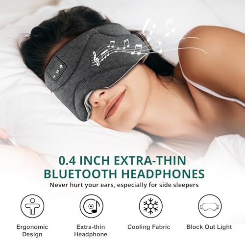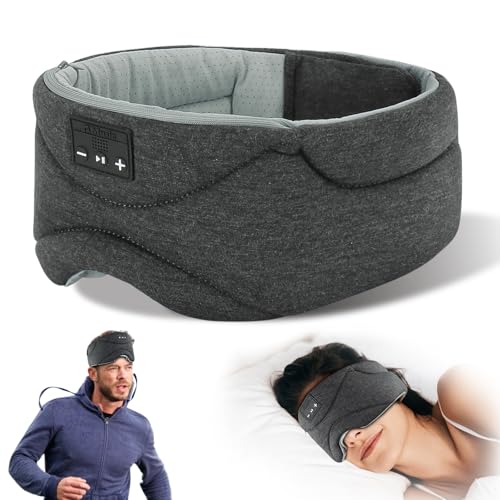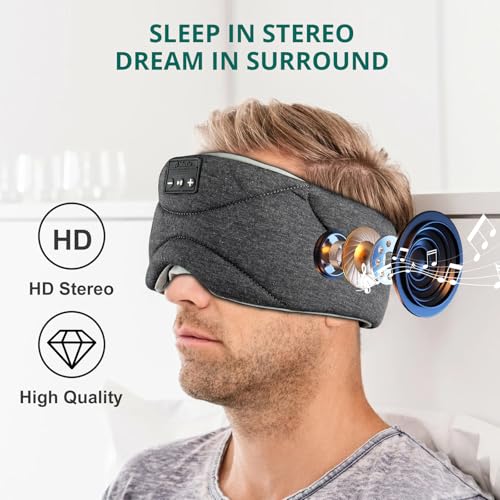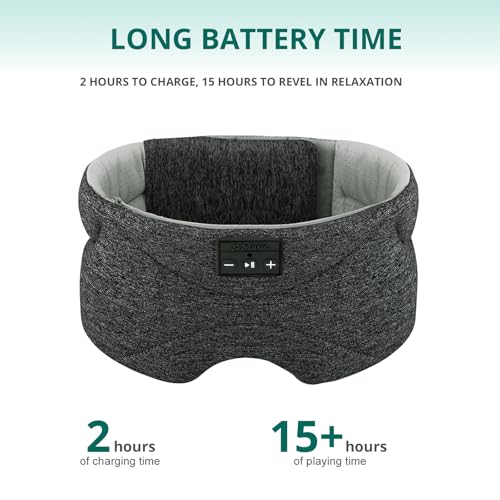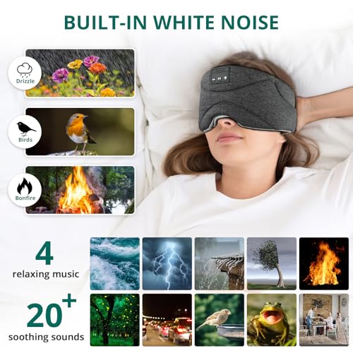 Découvrez le masque de sommeil Mucek avec écouteurs Bluetooth. Conçu pour optimiser votre sommeil, ce bandeau innovant intègre 20 sons blancs et 4 musiques relaxantes, y compris des bruits de pluie, de vagues et de feu de camp, pour masquer les nuisances sonores extérieures et favoriser un sommeil profond.