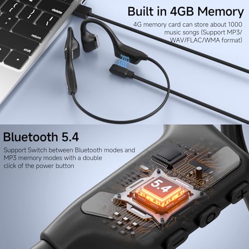 Technologie de Conduction Osseuse : Profitez d'une transmission audio unique où les ondes sonores passent par les os du crâne, évitant l'obstruction du conduit auditif et assurant un confort optimal. Étanchéité IPX8 : Idéaux pour la natation et la douche, ces écouteurs étanches incluent une mémoire MP3 4G intégrée pour écouter votre musique préférée sans interruptions sous-marines. Passez simplement en mode MP3 sous l'eau. Connexion Durable : Grâce à la technologie Bluetooth 5.4, bénéficiez de 240 heures d'autonomie en veille et 8 heures de lecture après seulement 2 heures de charge complète. Design Oreille Ouverte : Adaptés à diverses activités sportives telles que la course, l'exercice et le cyclisme, ces écouteurs évitent les problèmes de transpiration et garantissent une expérience d'écoute sans souci. Sans Fil et Confortables : Ces écouteurs true wireless garantissent une liberté de mouvement totale sans compromis sur la qualité du son.