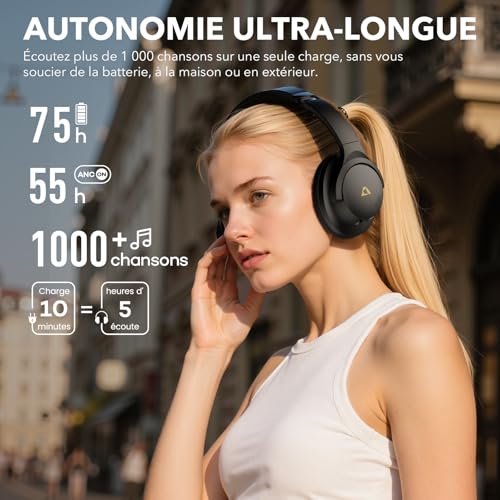 Écoute longue durée : Profitez jusqu'à 75 heures d’écoute, 55 heures avec la réduction de bruit activée. Une recharge rapide de 10 minutes assure 5 heures d’écoute supplémentaire.