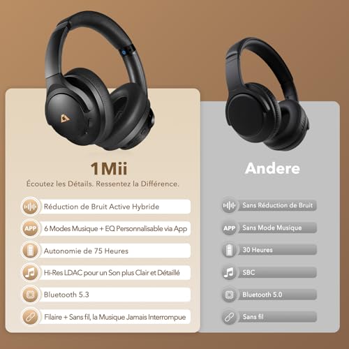 Découvrez la sophistication du casque Bluetooth sans fil 1Mii Y8+ à réduction de bruit active hybride qui offre une expérience audio de qualité studio grâce à l'audio Hi-Res LDAC. Ce casque circum-auriculaire en noir optimise chaque note pour un son fidèle, des basses profondes aux aigus clairs.