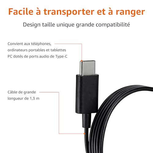 Compatibilité : Grâce à leur prise USB-C, ces écouteurs s'adaptent facilement à une large gamme d'appareils, y compris les téléphones, ordinateurs portables, et tablettes équipés de ports audio de type C. Qualité sonore : Profitez d'un équilibre parfait entre les hautes, moyennes et basses fréquences pour des sons et voix réalistes. Fonctionnalités pratiques : Dotés d'un microphone intégré et d'un bouton de commande, ces écouteurs permettent de gérer les appels et la lecture audio facilement. Notez que le volume doit être ajusté via votre appareil. Portabilité : Leur design compact et facile à ranger facilite le transport, vous permettant de les emporter partout avec vous. Offrez à votre musique et à vos appels un son clair et réaliste grâce aux écouteurs USB-C filaires d'Amazon Basics. Passez à une écoute améliorée avec des fonctionnalités pratiques et un design ajustable pour chaque utilisateur.