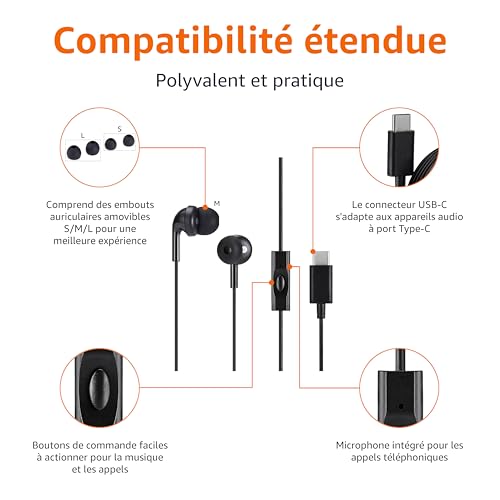 Découvrez les écouteurs intra-auriculaires filaires USB-C d'Amazon Basics, conçus pour offrir une écoute confortable et polyvalente. Ces écouteurs, équipés d'embouts en silicone amovibles en tailles S, M et L, garantissent un ajustement parfait pour une expérience optimale.