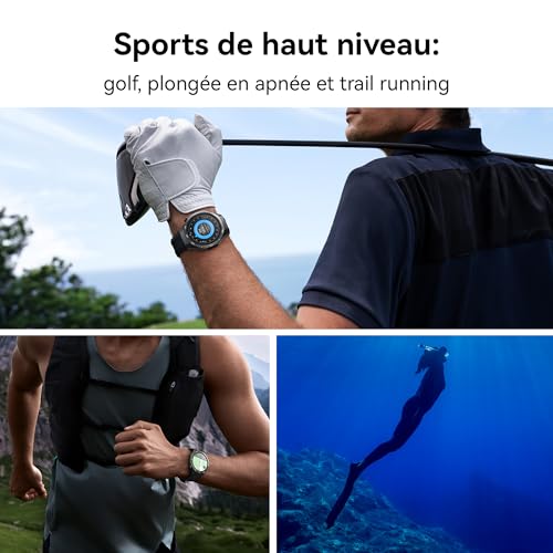 Programmes d'entraînement : Profitez de séances d'entraînement de haut niveau, incluant golf, plongée en apnée et trail running, ainsi que d'une navigation fluide au poignet pour rester sur la bonne voie grâce aux itinéraires cartographiques en temps réel.